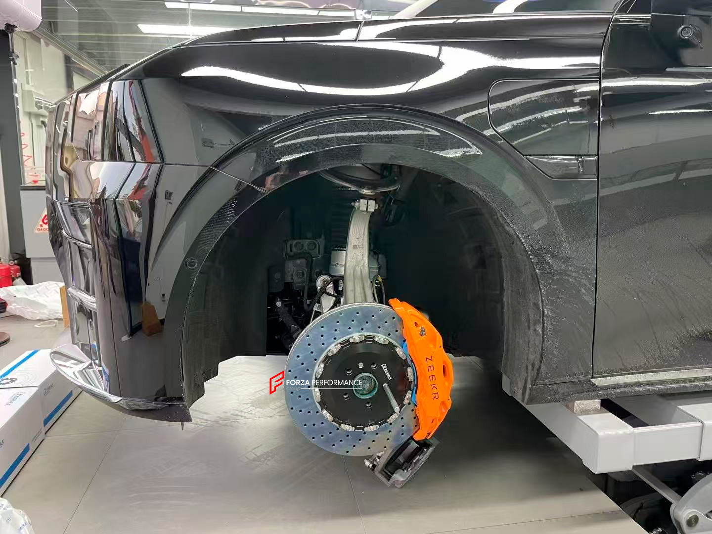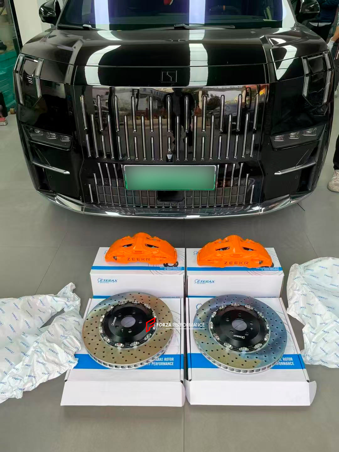 In the photos above you can see an installed Forza Performance Group set of large front brakes for the ZEEKR 009 with 420x38mm brake discs by 21-inch brake rotors.